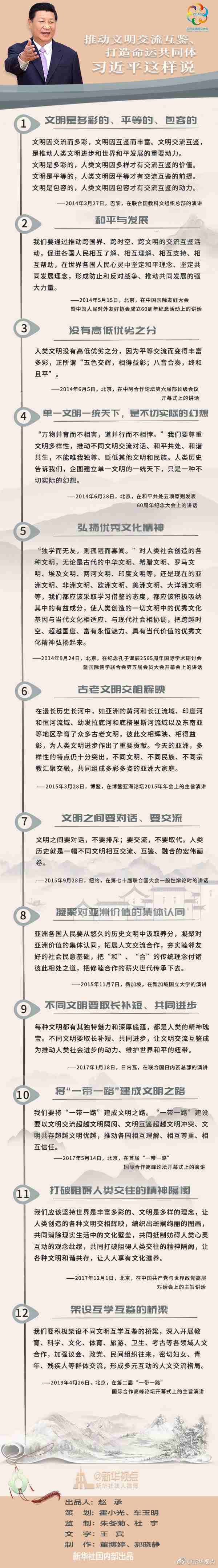 亞洲文明對(duì)話大會(huì)將于5月15日在北京開(kāi)幕。圍繞“亞洲文明交流互鑒與命運(yùn)共同體”主題,大會(huì)將為亞洲文明互學(xué)互鑒、繁榮發(fā)展搭建平臺(tái)。關(guān)于文明交流互鑒,習(xí)近平主席有過(guò)哪些精辟論述?讓我們一起聆聽(tīng)。