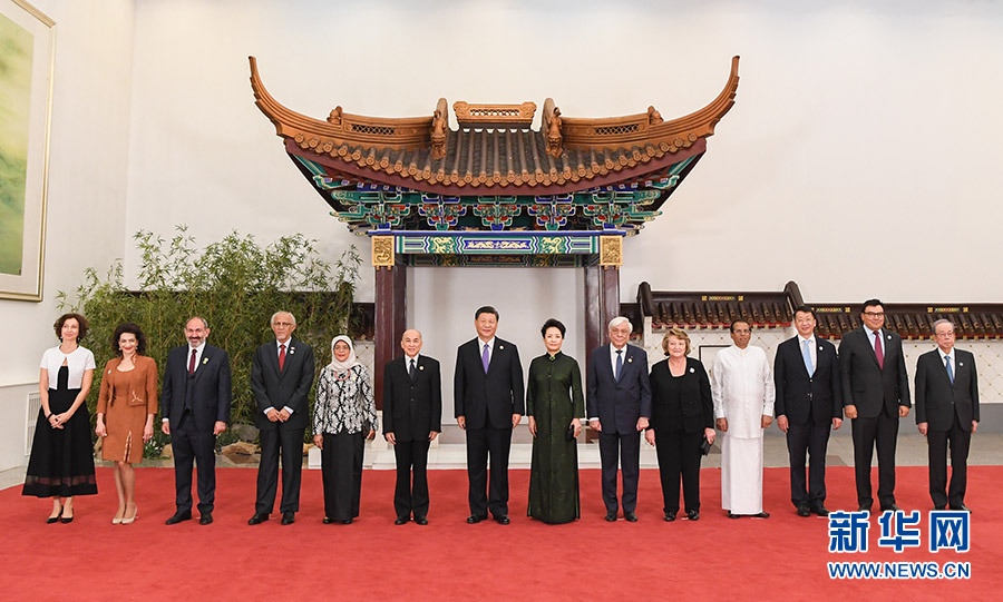 5月14日,國家主席習近平和夫人彭麗媛在北京人民大會堂舉行宴會,歡迎出席亞洲文明對話大會的外方領導人夫婦及嘉賓。這是習近平和彭麗媛同外方領導人夫婦及嘉賓合影。 新華社記者 饒愛民 攝