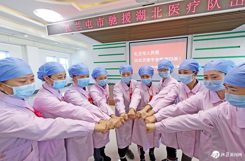 根據(jù)疫情防治需要,呼倫貝爾扎蘭屯市中蒙醫(yī)院醫(yī)療隊(duì)的10名護(hù)士馳援湖北。2月17日,護(hù)士們?cè)诔霭l(fā)前互相加油鼓勁,帶著責(zé)任,帶著祝愿,向湖北出發(fā)。(通訊員:韓冷)