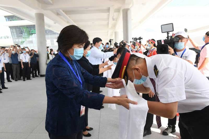 自治區(qū)黨委副書記、自治區(qū)主席布小林宣布赤喀高鐵正式開通運營,并與自治區(qū)副主席艾麗華、自治區(qū)政府秘書長包振玉以及中國鐵路沈陽局集團(tuán)有限公司、蒙遼鐵路客運專線有限責(zé)任公司、赤峰市委負(fù)責(zé)同志一起為列車組人員敬獻(xiàn)哈達(dá)。