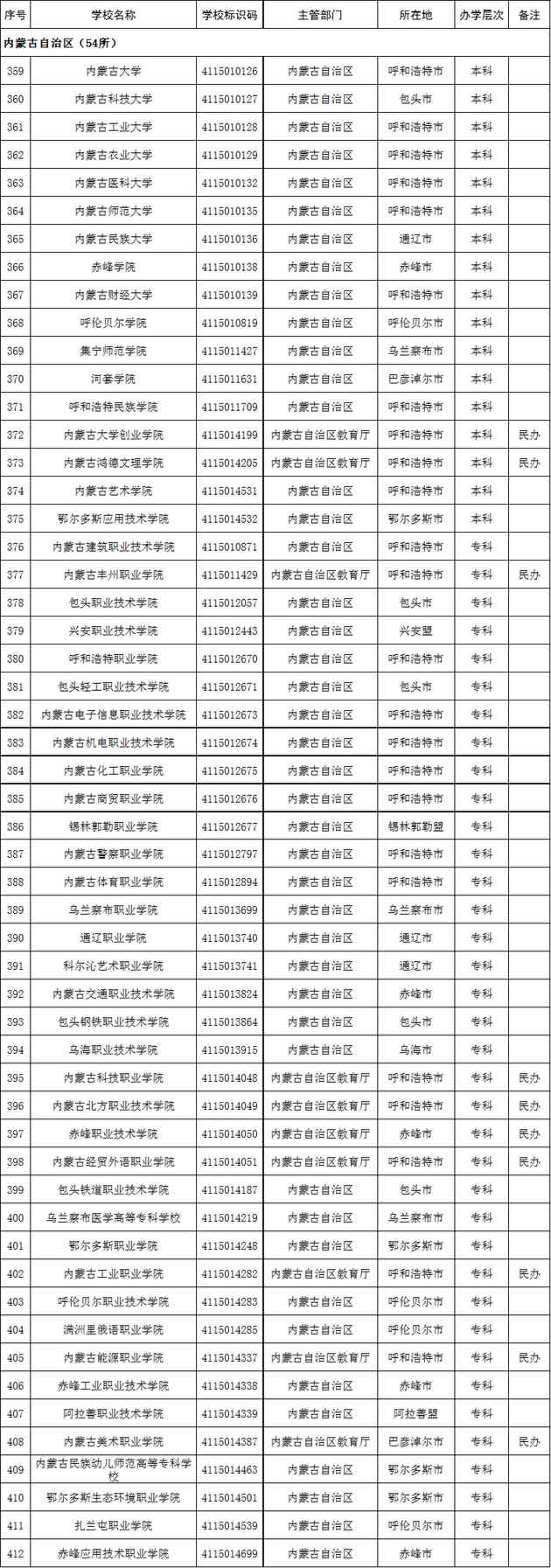 截至2020年6月30日,全國高等學(xué)校共計3005所,其中:普通高等學(xué)校2740所,含本科院校1258所、高職(專科)院校1482所;成人高等學(xué)校265所。本名單未包含港澳臺地區(qū)高等學(xué)校。以下為內(nèi)蒙古自治區(qū)2020年普通高等學(xué)校名單(54所)。