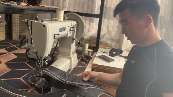圖為阿巴嘎旗綜合實訓基地內(nèi),一名小伙子正在制作搏克手的摔跤服。
