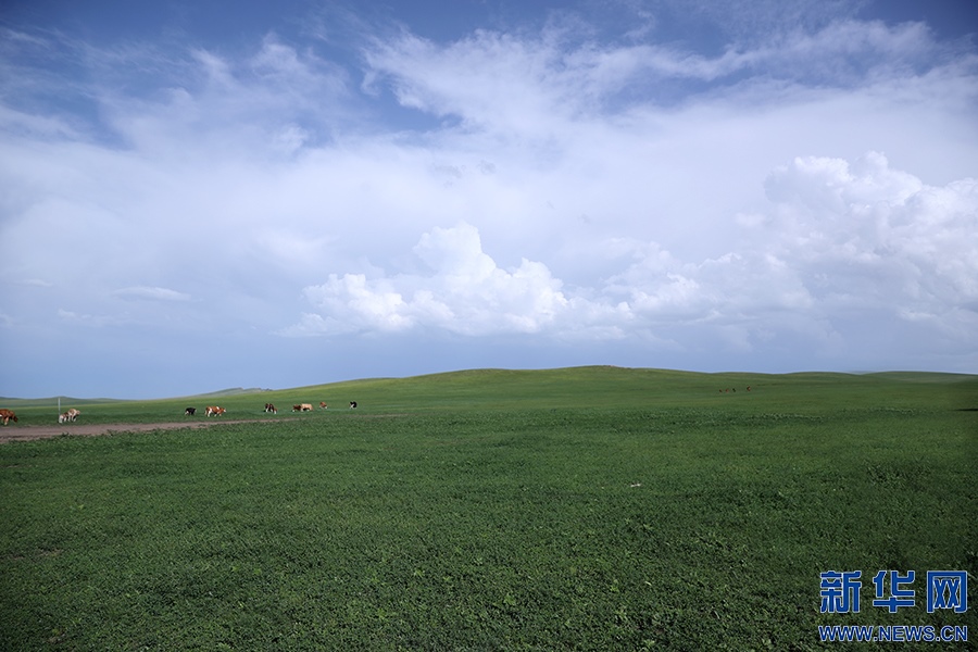 8月2日,其日麥拉圖家的幾頭牛在草場上吃草。新華網(wǎng)記者焦鵬攝