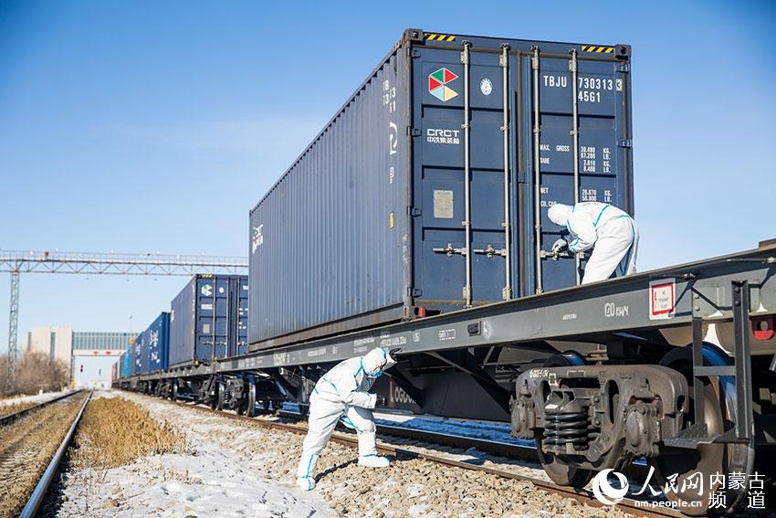 二連出入境邊防檢查站執(zhí)勤民警對中歐班列進(jìn)行車體檢查。郭鵬杰 攝