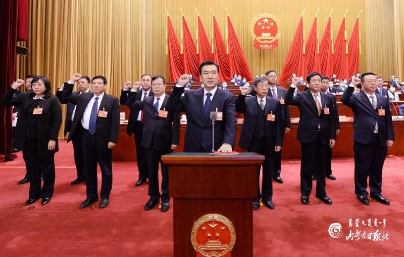 1月30日上午,內(nèi)蒙古人民會堂國徽高懸,五星紅旗鮮艷奪目,自治區(qū)十三屆人大四次會議新當(dāng)選人員憲法宣誓儀式在這里舉行。