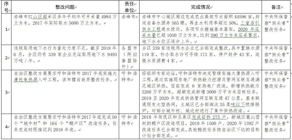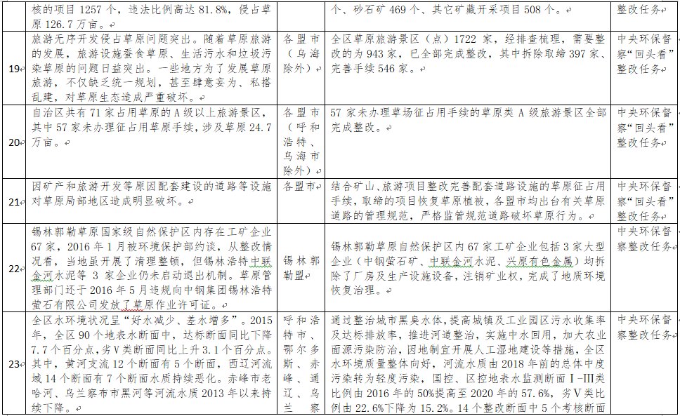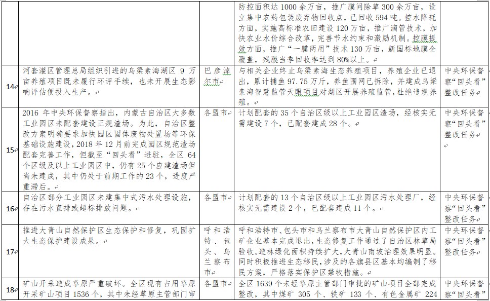 中央環(huán)境保護(hù)督察以來(lái),自治區(qū)各級(jí)黨委政府及相關(guān)部門(mén)高度重視反饋意見(jiàn)整改工作,貫徹落實(shí)習(xí)近平生態(tài)文明思想的自覺(jué)性和主動(dòng)性顯著增強(qiáng),采取強(qiáng)有力措施積極推動(dòng)整改工作,整改工作取得階段性成果。近期部分整改任務(wù)已通過(guò)自治區(qū)相關(guān)委辦廳局驗(yàn)收,現(xiàn)予以公示,公示期2021年2月5日至2月9日,未提出異議的整改任務(wù)給予銷(xiāo)號(hào)(聯(lián)系電話:0471-4632171)。
