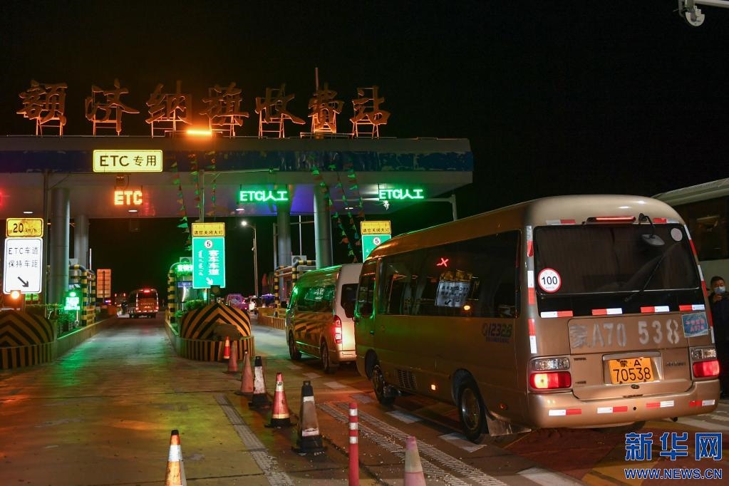 10月29日,滯留在額濟(jì)納旗的旅游包車(chē)有序通過(guò)額濟(jì)納旗收費(fèi)站。新華社記者 貝赫 攝