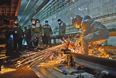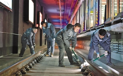 昏暗、逼仄的軌行區(qū)內(nèi),軌道檢修師們焊接鋼軌時迸發(fā)的火花顯得格外耀眼,維修軌道設(shè)備時敲擊鋼軌的聲音顯得格外清脆、響亮。據(jù)田智宏介紹,一個軌道檢修師每次夜間軌行區(qū)的巡檢作業(yè)大約要走7公里路程。他和工友們每天要檢查數(shù)千個部件,測量上百個數(shù)據(jù),其中一項重要巡檢工作就是檢查扣件和接頭聯(lián)結(jié)零件的組成部件是否安裝牢固,螺栓是否松動。他指了指自己腳上的鞋說:“我們的檢修對象不僅笨重且危險性較高,為了防止腳部受到傷害,鞋子都是特制的防砸絕緣鞋。”
