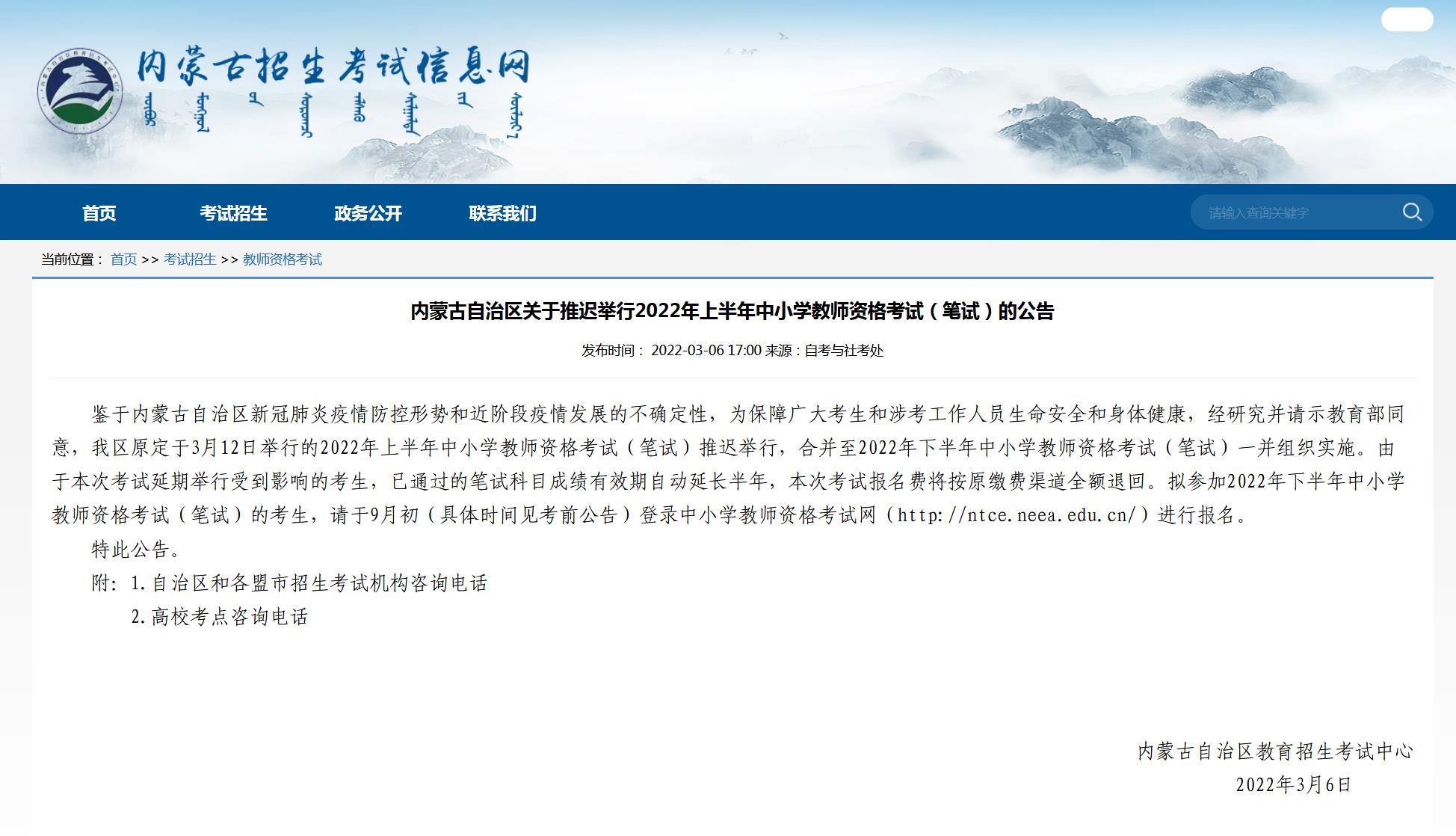 據(jù)內(nèi)蒙古招生考試信息網(wǎng)消息,3月6日,內(nèi)蒙古自治區(qū)教育招生考試中心發(fā)布公告稱,鑒于內(nèi)蒙古自治區(qū)新冠肺炎疫情防控形勢和近階段疫情發(fā)展的不確定性,為保障廣大考生和涉考工作人員生命安全和身體健康,經(jīng)研究并請示教育部同意,原定于3月12日舉行的2022年上半年中小學(xué)教師資格考試(筆試)推遲舉行,合并至2022年下半年中小學(xué)教師資格考試(筆試)一并組織實施。由于本次考試延期舉行受到影響的考生,已通過的筆試科目成績有效期自動延長半年,本次考試報名費將按原繳費渠道全額退回?! ?br/>