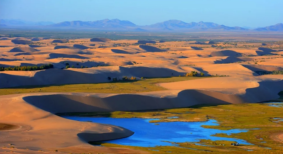 沙區(qū)是我國旅游資源的集中分布區(qū),“大漠孤煙直,長河落日?qǐng)A”是對(duì)雄偉、壯觀、大漠風(fēng)光的寫照,而不同分布區(qū)域的沙漠景觀又各具特色。在內(nèi)蒙古有大面積的草原、森林、沙地、沙漠、河流、湖泊等各類生態(tài)系統(tǒng),共同構(gòu)成了山水林田湖草沙綜合生態(tài)安全屏障。