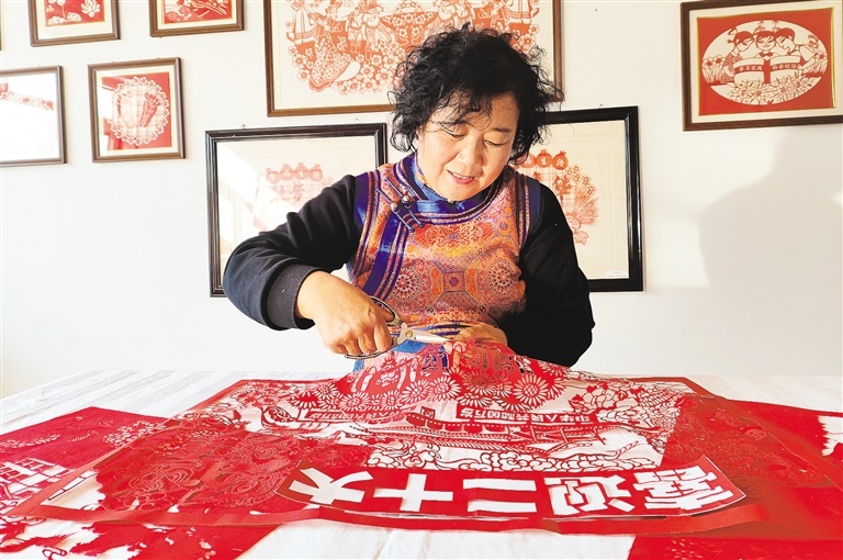 10月15日下午,自治區(qū)非遺剪紙項(xiàng)目傳承人、呼和浩特市土默特左旗畢克齊鎮(zhèn)紅秀剪紙合作社發(fā)起人李還秀在創(chuàng)作慶祝黨的二十大勝利召開(kāi)系列剪紙作品。連日來(lái),全區(qū)各地群眾通過(guò)剪紙、書(shū)法等藝術(shù)形式,表達(dá)對(duì)盛會(huì)的期盼、對(duì)祖國(guó)的祝福。記者 鄭學(xué)良 實(shí)習(xí)生 郭亞麗 攝