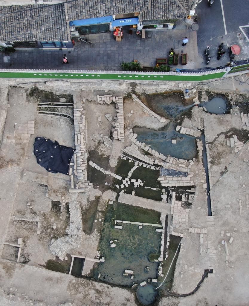 俯瞰朔門古港遺址發(fā)掘出的甕城遺址(10月10日攝,無人機照片)。新華社記者翁忻旸 攝