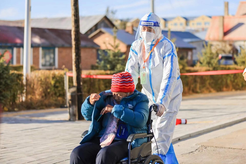 圖①額爾古納市檢察院干警幫助行動不便老人做核酸檢測。