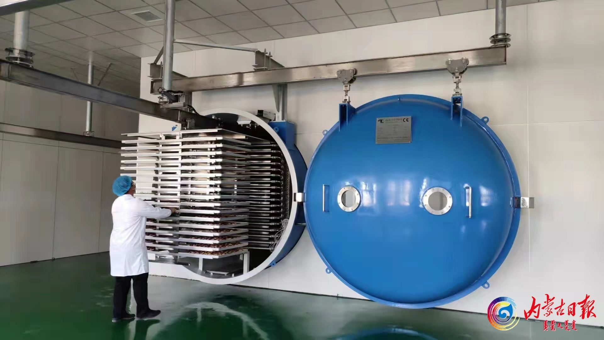 蒙果鮮食品有限公司員工將鮮果片裝入真空干燥倉進行凍干處理。