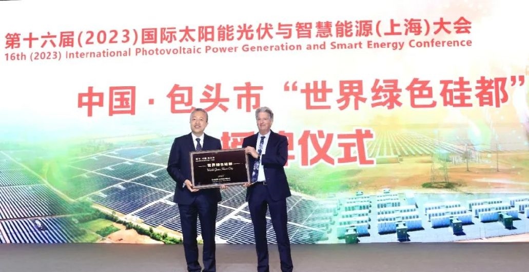 5月23日,第十六屆(2023)國際太陽能光伏與智慧能源(上海)大會召開。大會開幕式上,全球綠色能源理事會授予包頭市“世界綠色硅都”稱號。澳大利亞新南威爾士大學(xué)教授、超高效光電學(xué)研究中心兼任執(zhí)行研究主任、澳大利亞科學(xué)院院士馬丁·格林代表全球綠色能源理事會向包頭市授牌。自治區(qū)黨委常委、市委書記丁繡峰致辭并推介“世界綠色硅都”。市委副書記、市長張銳代表包頭市接牌。