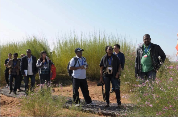 2017年9月,《聯(lián)合國(guó)防治荒漠化公約》第十三次締約方大會(huì)與會(huì)代表觀(guān)摩庫(kù)布其生態(tài)建設(shè)現(xiàn)場(chǎng)。