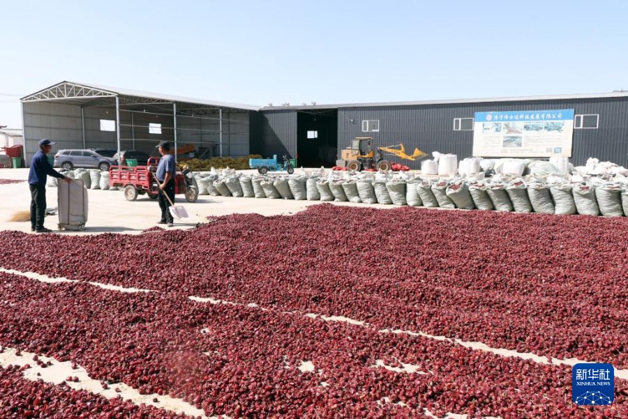 ??巴彥淖爾國家農高區(qū)辣椒加工企業(yè)正在晾曬辣椒。新華社記者李云平 攝