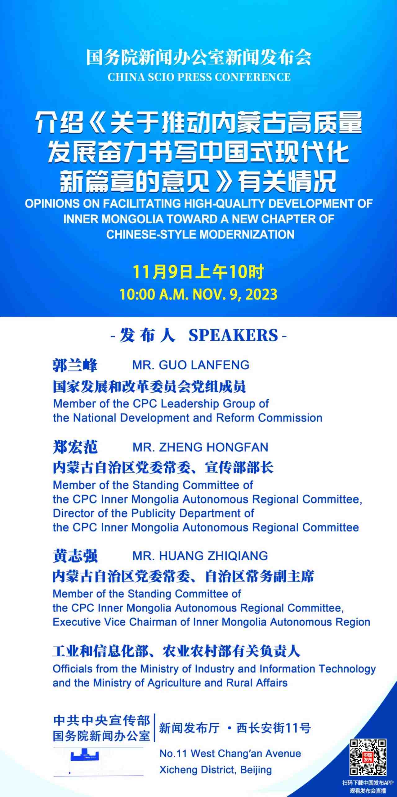 2023年11月9日(星期四)上午10時,國務(wù)院新聞辦公室舉行新聞發(fā)布會,請國家發(fā)展和改革委員會黨組成員郭蘭峰,內(nèi)蒙古自治區(qū)黨委常委、宣傳部部長鄭宏范,內(nèi)蒙古自治區(qū)黨委常委、自治區(qū)常務(wù)副主席黃志強和工業(yè)和信息化部、農(nóng)業(yè)農(nóng)村部有關(guān)負(fù)責(zé)人介紹《關(guān)于推動內(nèi)蒙古高質(zhì)量發(fā)展奮力書寫中國式現(xiàn)代化新篇章的意見》有關(guān)情況,并答記者問。