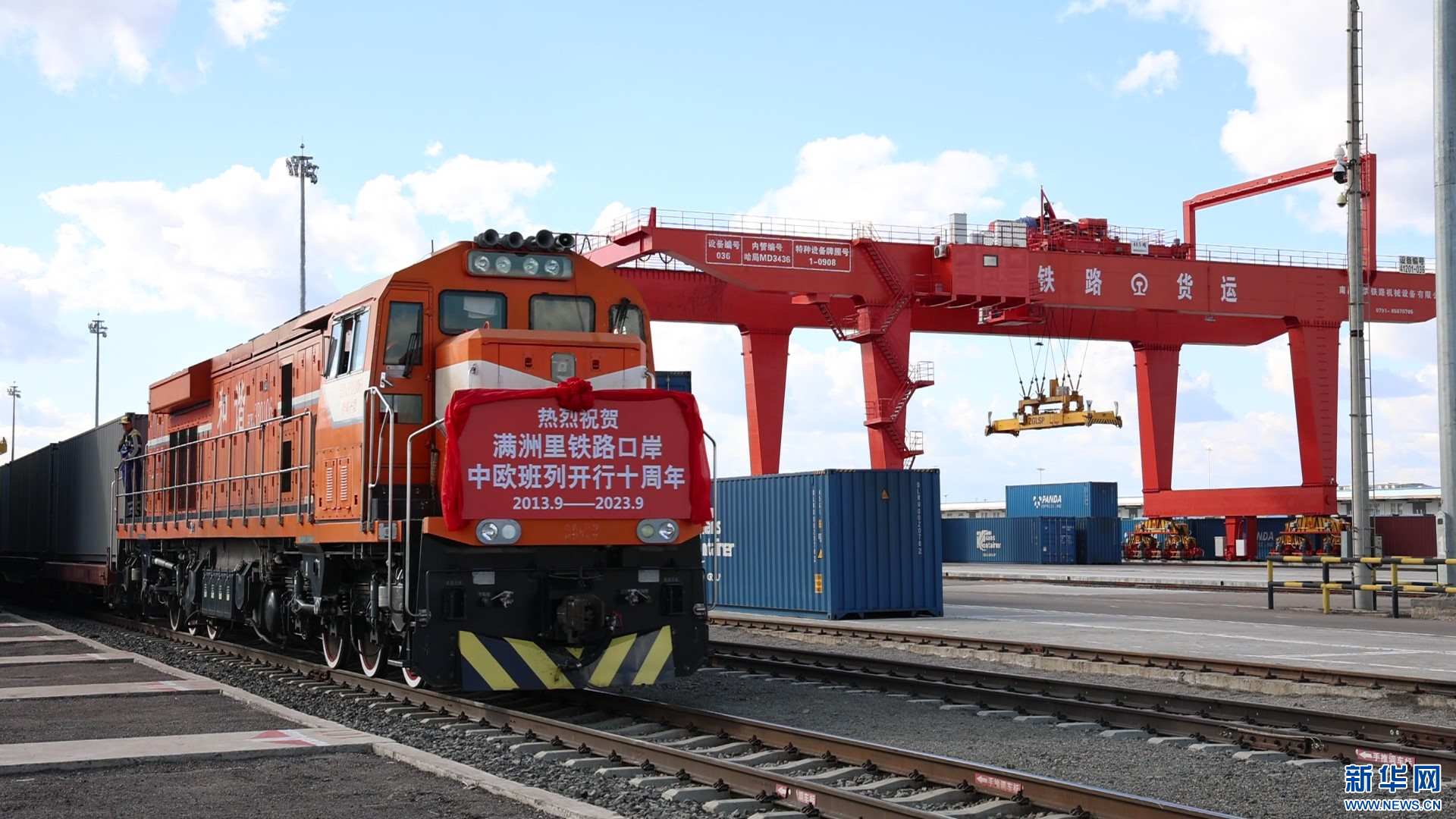 蘇-滿-歐集裝箱班列在滿洲里換裝。新華網(wǎng)發(fā) (李新軍 攝)