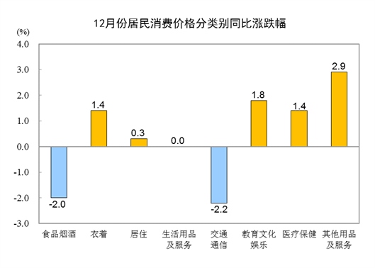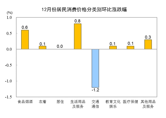 12月份,全國居民消費(fèi)價格環(huán)比上漲0.1%。其中,城市上漲0.1%,農(nóng)村上漲0.1%;食品價格上漲0.9%,非食品價格下降0.1%;消費(fèi)品價格上漲0.1%,服務(wù)價格上漲0.1%。
