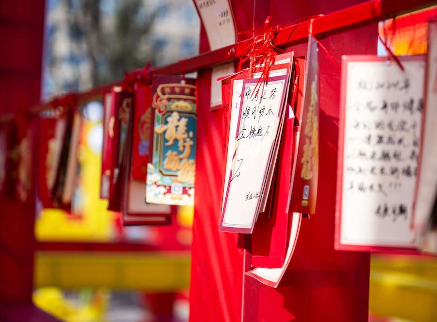 在九曲中,有九道門,其中八道門可以猜燈謎,猜對后換一張祈福卡來到吉祥門進(jìn)行許愿祈福。