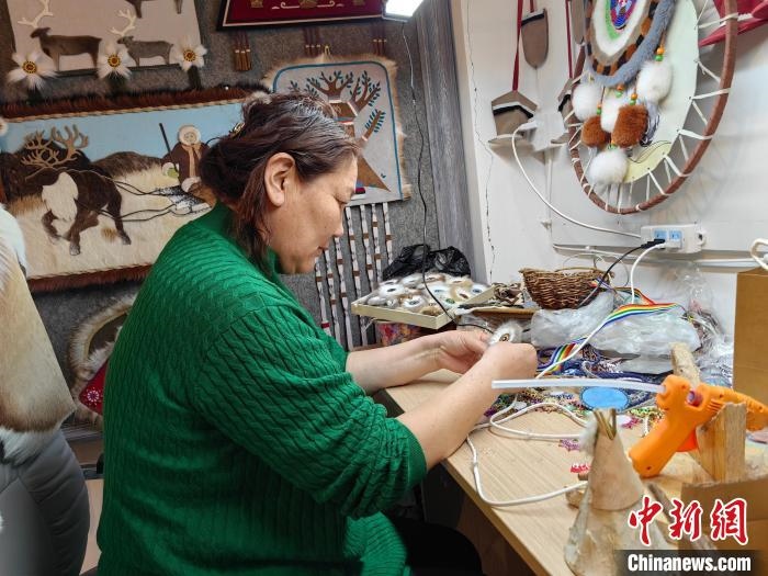 2月21日,在內(nèi)蒙古呼倫貝爾市鄂溫克族自治旗一家手工藝品工作室內(nèi),烏仁在制作太陽(yáng)花手工藝品。 于嘉 攝