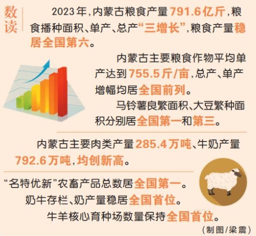 數(shù)字是發(fā)展最好的注腳。過去一年,內(nèi)蒙古緊扣“地、水、種”和“糧、肉、奶”6個重點,全力推動糧食單產(chǎn)再提高、牲畜養(yǎng)殖再增效,不斷擴大數(shù)量、提高質(zhì)量、增加產(chǎn)量,努力把國家重要農(nóng)畜產(chǎn)品生產(chǎn)基地建設得量大質(zhì)優(yōu),切實當好國家糧食安全“壓艙石”。