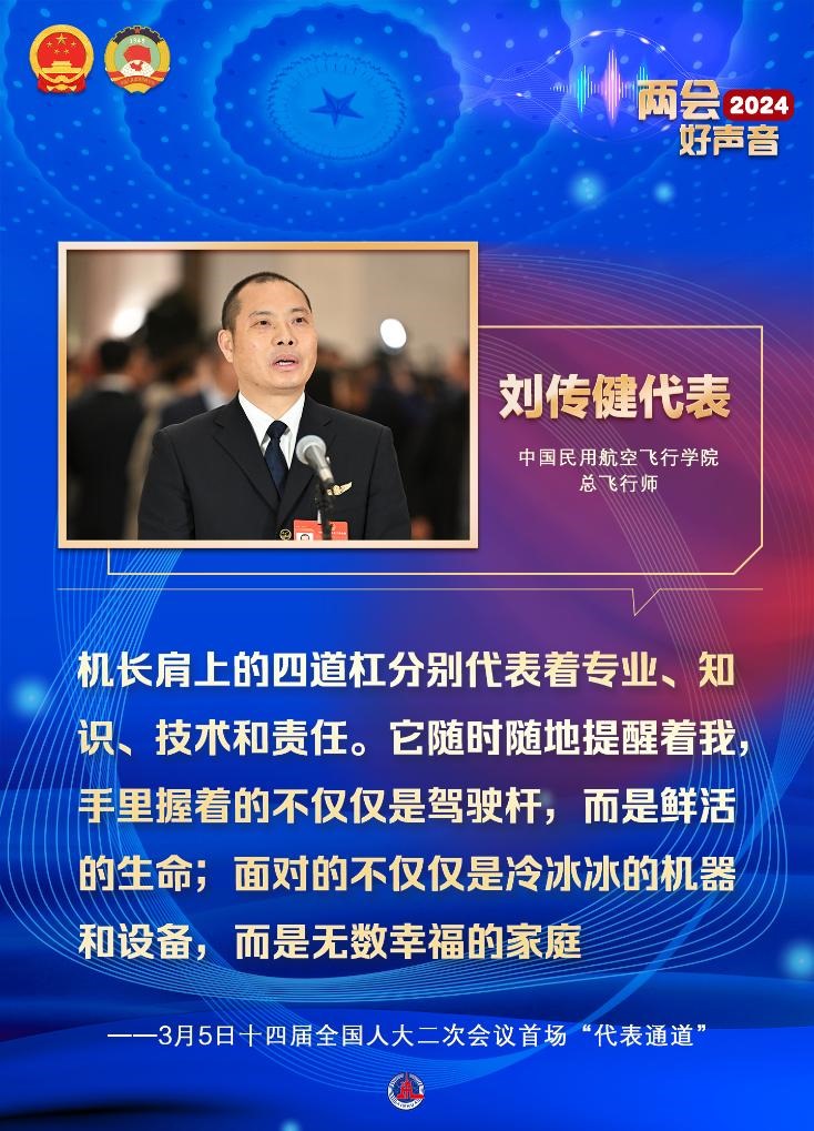劉傳健說:“機(jī)長肩上的四道杠分別代表著專業(yè)、知識、技術(shù)和責(zé)任。它隨時隨地提醒著我,手里握著的不僅僅是駕駛桿,而是鮮活的生命;面對的不僅僅是冷冰冰的機(jī)器和設(shè)備,而是無數(shù)幸福的家庭。”