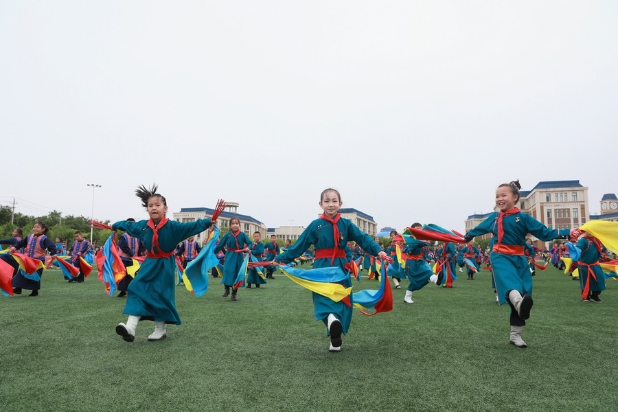 北疆新聞鄂爾多斯5月29日電(記者 張楊)“我們以鑄牢中華民族共同體意識(shí)為主線,創(chuàng)建了4個(gè)‘千人文化’特色課程,分別為千人足球、千人《江格爾》、千人筷子舞、千人棋類。”5月29日,內(nèi)蒙古鄂爾多斯鄂托克前旗“美育潤(rùn)心·筑夢(mèng)同行”第十四屆中小學(xué)師生藝術(shù)節(jié)暨慶“六一”國(guó)際兒童節(jié)多彩大課間操展示活動(dòng),在鄂托克前旗第一小學(xué)舉行。該校校長(zhǎng)阿拉騰達(dá)來(lái)接受記者采訪時(shí)表示,創(chuàng)建這個(gè)特色課程的主要目的,是培養(yǎng)孩子多方面的才藝,為祖國(guó)培養(yǎng)有用之才。