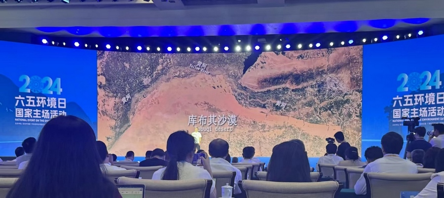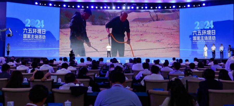 當(dāng)天在廣西南寧,生態(tài)環(huán)境部、中央文明辦、廣西壯族自治區(qū)人民政府聯(lián)合舉辦了2024年六五環(huán)境日國家主場活動。建設(shè)美麗中國,是實(shí)現(xiàn)中華民族偉大復(fù)興中國夢的重要內(nèi)容。在習(xí)近平生態(tài)文明思想指引下,一個人與自然和諧共生的美麗中國正從藍(lán)圖變?yōu)楝F(xiàn)實(shí)?;顒犹貏e設(shè)立了“從這里看見美麗中國”主題展示環(huán)節(jié),從全國各地的案例中遴選了6個“美麗中國建設(shè)創(chuàng)新示范案例”,內(nèi)蒙古杭錦旗庫布其沙漠億利生態(tài)示范區(qū)“綠水青山就是金山銀山”實(shí)踐創(chuàng)新基地作為唯一的“兩山”基地案例在活動現(xiàn)場進(jìn)行了展示。來自億利資源集團(tuán)的庫布其治沙工程師田旺應(yīng)邀參加活動,他結(jié)合親身經(jīng)歷,向全球嘉賓介紹了政府、企業(yè)、農(nóng)牧民合力治理庫布其沙漠三十多年,在生態(tài)文明思想引領(lǐng)下將“死亡之?!苯ㄔO(shè)成為生命綠洲的生動故事。