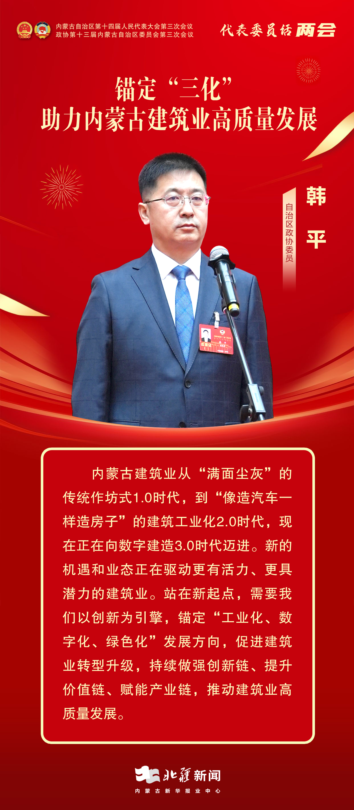 北疆新聞呼和浩特1月13日電(記者 張鑫 李姝廷)委員通道,通民心、道發(fā)展。1月13日上午,自治區(qū)兩會首場“委員通道”正式開啟。自治區(qū)政協(xié)委員,興泰建設(shè)集團有限公司黨委書記、董事長韓平圍繞“建筑業(yè)高質(zhì)量發(fā)展”的內(nèi)容建真言、獻良策。