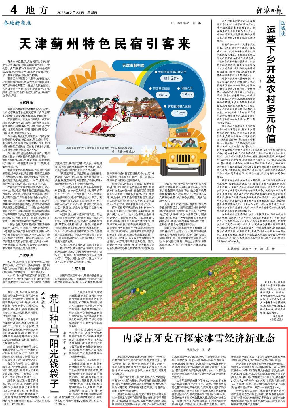 2025年2月23日,《經(jīng)濟(jì)日?qǐng)?bào)》第4版刊發(fā)題為《內(nèi)蒙古牙克石探索冰雪經(jīng)濟(jì)新業(yè)態(tài)》的 文章,報(bào)道了2024年內(nèi)蒙古自治區(qū)牙克石市共接待國(guó)內(nèi)外旅游者286.62萬(wàn)人次,同比增長(zhǎng)39.66%;旅游業(yè)總收入35.57億元,同比增長(zhǎng)22.66%。