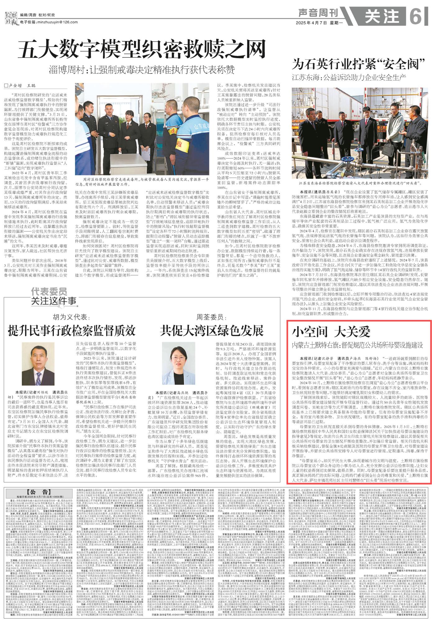 2025年4月7日,《檢察日?qǐng)?bào)》第6版刊發(fā)題為《內(nèi)蒙古土默特右旗:督促規(guī)范公共場所母嬰設(shè)施建設(shè)》的文章,報(bào)道了內(nèi)蒙古自治區(qū)土默特右旗檢察院以母嬰室這個(gè)群眾身邊的小事為切入點(diǎn),充分發(fā)揮公益訴訟檢察職能,讓婦女兒童的權(quán)益得到切實(shí)保障,讓媽媽們感受到全社會(huì)的尊重和關(guān)愛。