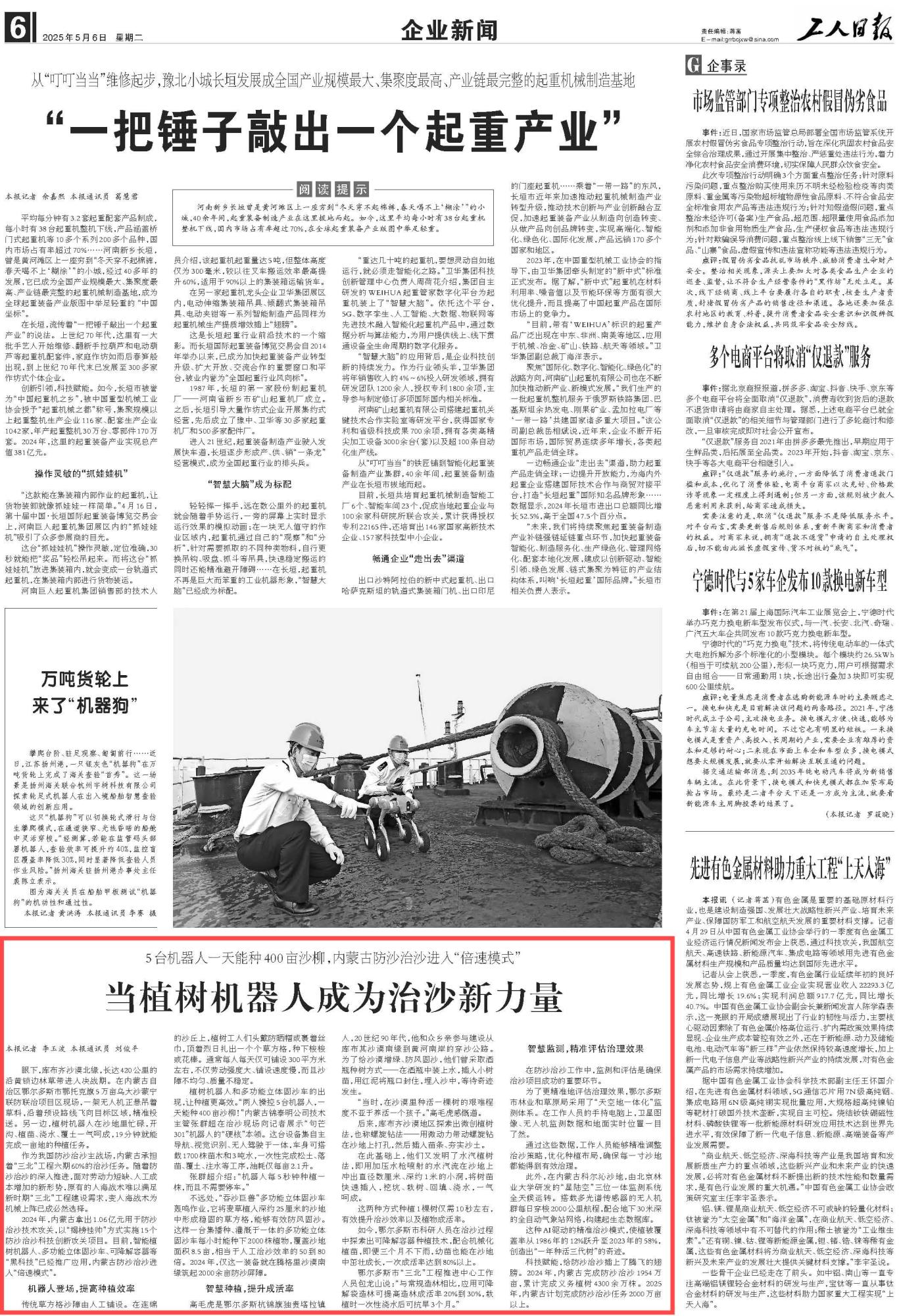 2025年5月6日,《工人日報》第6版刊發(fā)題為《當植樹機器人成為治沙新力量》的文章,報道了內蒙古作為我國防沙治沙主戰(zhàn)場,承擔著“三北”工程六期60%的治沙任務。隨著防沙治沙的深入推進,智能植樹機器人、多功能立體固沙車、可降解容器等“黑科技”已經推廣應用,內蒙古防沙治沙進入“倍速模式”。