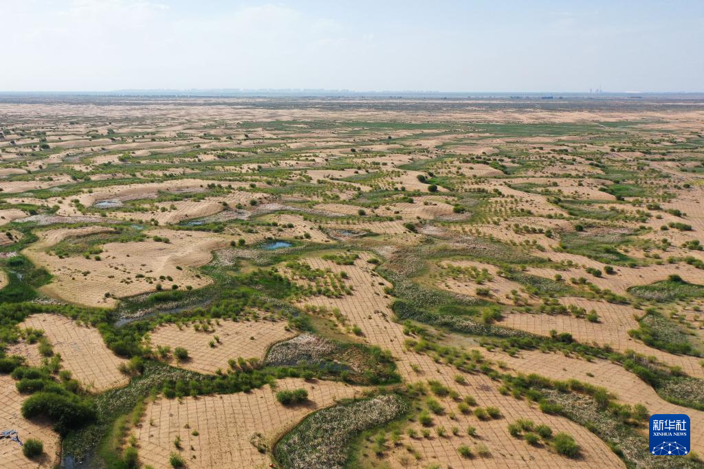 6月7日,在鄂爾多斯市達拉特旗境內(nèi)的庫布其沙漠,工人在治沙(無人機照片)新華社記者 李志鵬 攝