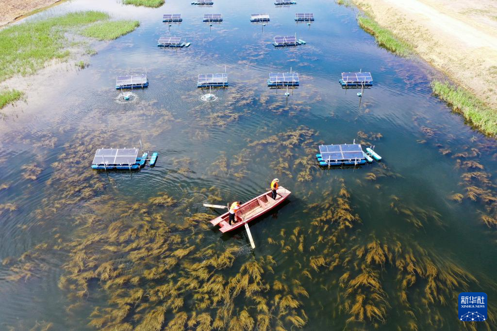 6月4日,在烏拉特前旗九排干人工濕地,工作人員在巡檢太陽能曝氣機。該設(shè)備可對進入烏梁素海的水體曝氣增氧(無人機照片)新華社記者 李志鵬 攝