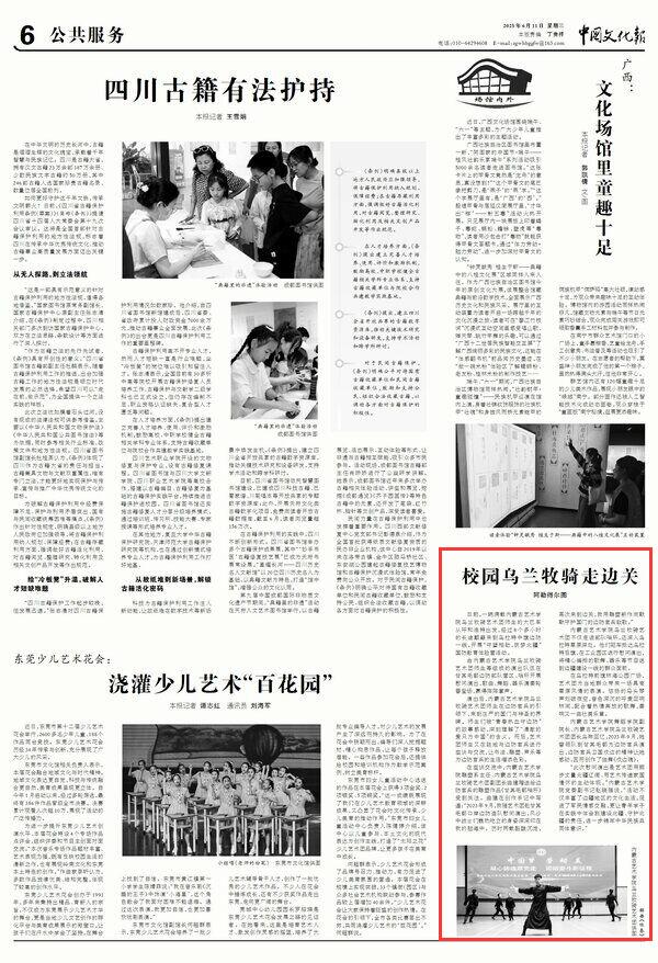 2025年6月11日,《中國文化報》第6版刊發(fā)題為《校園烏蘭牧騎走邊關》的文章,報道了內(nèi)蒙古藝術學院烏蘭牧騎藝術團師生來到烏拉特中旗邊防一線,開展慰問演出,歌曲、舞蹈、器樂演奏輪番登場,贏得陣陣掌聲。