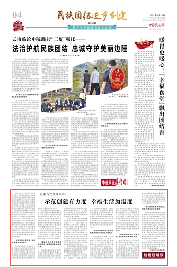 2025年9月23日,《中國民族報》第4版刊發(fā)題為《內蒙古巴彥淖爾市:示范創(chuàng)建有力度 幸福生活加溫度》的文章,報道了2023年6月,習近平總書記在內蒙古自治區(qū)考察調研時,首次提出“鑄牢中華民族共同體意識是新時代黨的民族工作的主線,也是民族地區(qū)各項工作的主線”。巴彥淖爾市始終牢記囑托,將“鑄牢”貫穿于想問題、作決策、干工作的全過程。