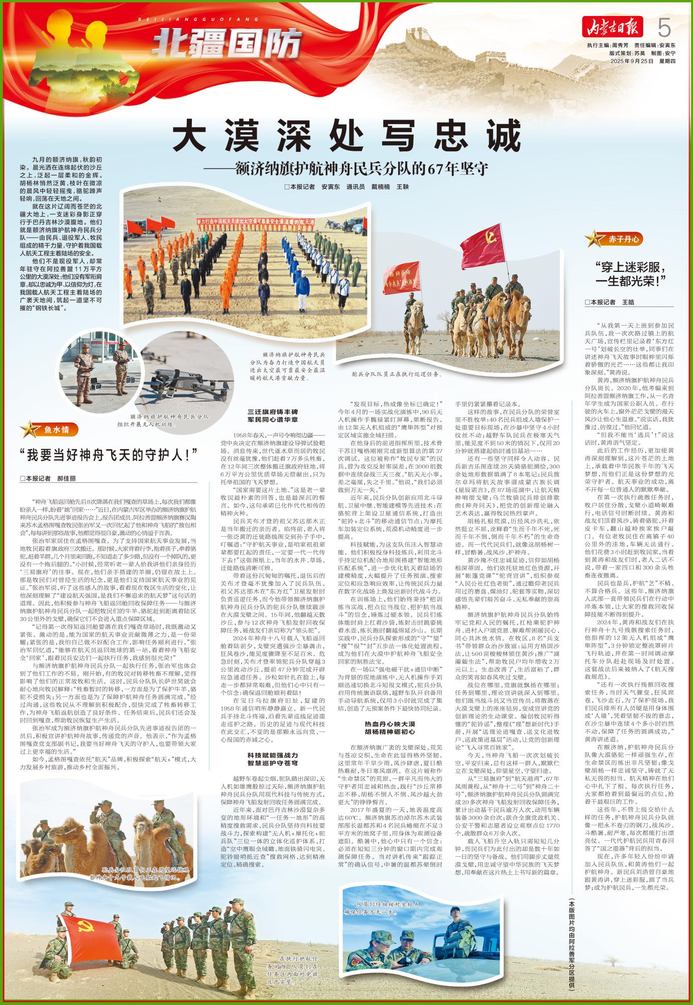 從“三易旗府”到“航天港灣”,67年風雨兼程,從“神舟十二號”到“神舟二十號”,額濟納旗護航神舟民兵分隊圓滿完成20多次神舟飛船發(fā)射回收保障任務,累計出動基干民兵逾萬人次,動用車輛裝備3000余臺次;聯(lián)合全旗黨政機關(guān)、公安干警和志愿者設立觀察點位1770個,疏散群眾6萬余人次。