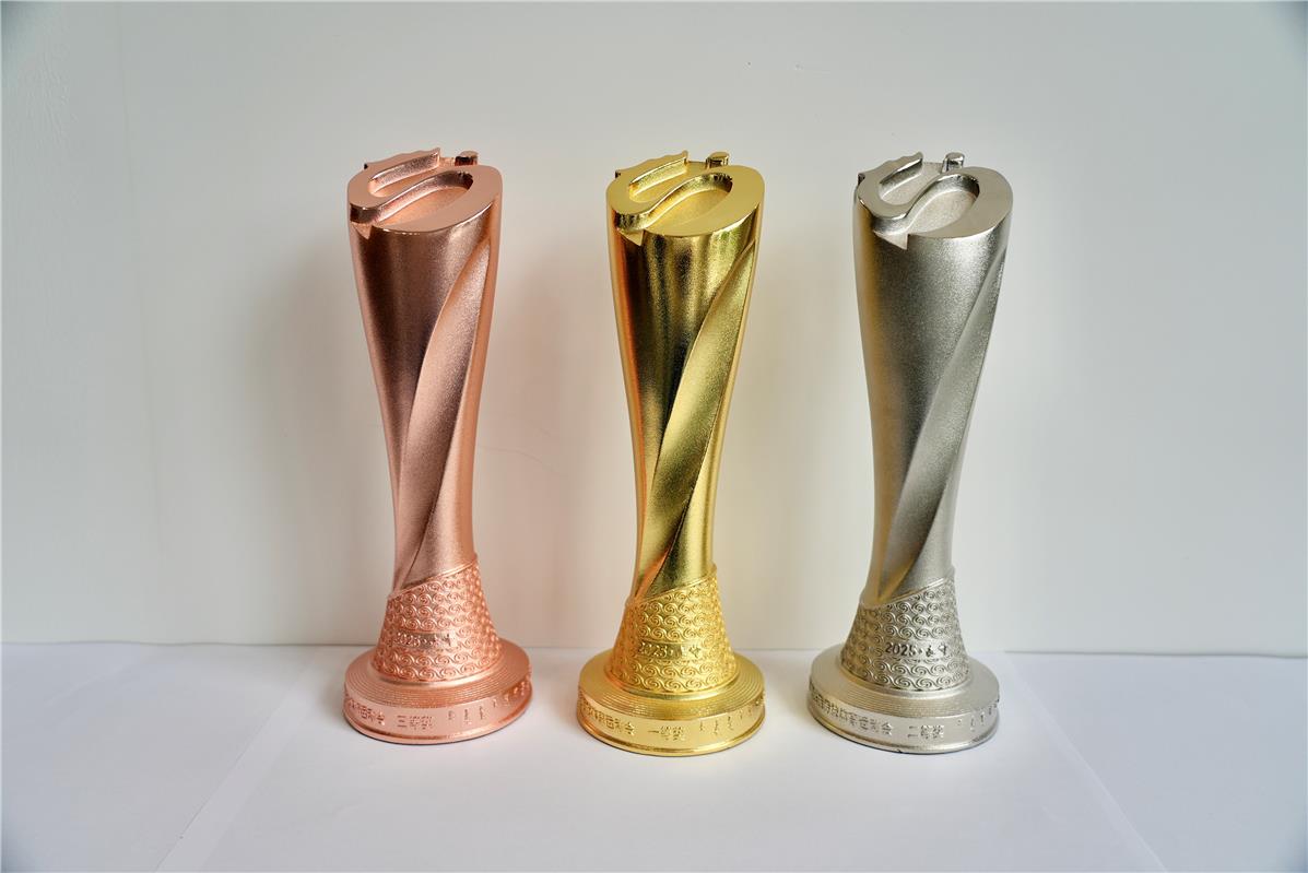獎(jiǎng)杯頂部為會(huì)徽“奮進(jìn)”,以傾斜45度的方式呈現(xiàn);外形采用扭轉(zhuǎn)升騰樣式設(shè)計(jì),體現(xiàn)了各民族運(yùn)動(dòng)員在少數(shù)民族傳統(tǒng)體育運(yùn)動(dòng)會(huì)賽場(chǎng)上英勇矯健的身姿和拼搏向上的精神。底部為紅山文化彩陶雙旋紋環(huán)繞四周,并鐫刻“2025·赤峰”,既展現(xiàn)中華優(yōu)秀傳統(tǒng)文化,又明確了本屆運(yùn)動(dòng)會(huì)舉辦地區(qū)及時(shí)間,激勵(lì)各民族運(yùn)動(dòng)員以參加本屆全區(qū)少數(shù)民族傳統(tǒng)體育運(yùn)動(dòng)會(huì)為榮耀,傳承和弘揚(yáng)民族傳統(tǒng)體育文化,構(gòu)筑中華民族共有精神家園,鑄牢中華民族共同體意識(shí)。獎(jiǎng)杯整體開(kāi)模澆鑄,鋅合金制作,表面電鍍金、銀、銅顏色。(記者 肖璐)