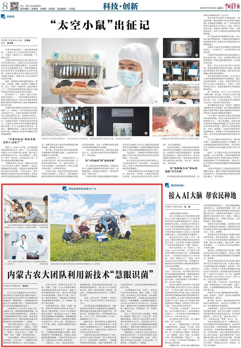 2025年11月5日,《中國青年報》第8版刊發(fā)題為《內(nèi)蒙古農(nóng)大團隊利用新技術(shù)“慧眼識菌”》的文章,報道了在10月28日福建泉州舉行的第三屆全國博士后創(chuàng)新創(chuàng)業(yè)大賽總決賽上,來自內(nèi)蒙古農(nóng)業(yè)大學博士后馬騰團隊的參賽項目“慧眼識菌——數(shù)據(jù)賦能中國菌邁向產(chǎn)業(yè)強國之路”,在創(chuàng)新組的農(nóng)業(yè)與現(xiàn)代食品賽道獲得金獎。