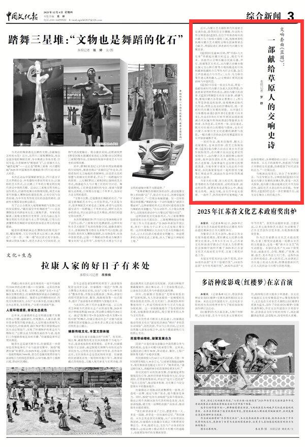 2025年12月4日《中國文化報》第3版刊發(fā)了《交響套曲《藍圖》:一部獻給草原人的交響史詩》的文章,報道了近日,內(nèi)蒙古藝術(shù)劇院委約作曲家方崠清作曲,曾偉擔(dān)任文學(xué)撰稿、作詞的大型交響套曲《藍圖》,在位于呼和浩特市的內(nèi)蒙古烏蘭恰特大劇院上演,指揮家黃屹執(zhí)棒內(nèi)蒙古藝術(shù)劇院交響樂團演奏家合力獻藝,用國際語匯講述新時代內(nèi)蒙古發(fā)展故事。