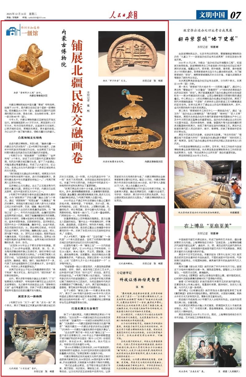 12月16日,《人民日?qǐng)?bào)海外版》刊發(fā)《內(nèi)蒙古博物院 鋪展北疆民族交融畫卷》,報(bào)道內(nèi)蒙古自治區(qū)首個(gè)國(guó)家一級(jí)博物館今年6月搬遷至新館后開館試運(yùn)行。新館建筑面積14.7萬平方米,展覽面積3.9萬平方米,均為舊館的兩倍多。這座城市文化地標(biāo),以更開闊的空間、更精彩的展覽、更豐富的體驗(yàn),為公眾打開一扇了解內(nèi)蒙古、領(lǐng)略北疆文化的窗口。