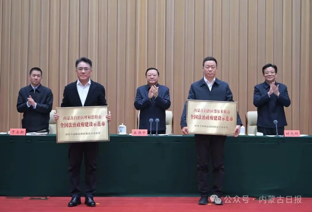 自治區(qū)黨委副書記、自治區(qū)黨委全面依法治區(qū)委員會副主任時光輝主持會議。自治區(qū)黨委、人大常委會、政府、政協(xié)有關(guān)領(lǐng)導(dǎo)同志和法檢“兩長”出席。會議為自治區(qū)獲評第三批全國法治政府建設(shè)示范地區(qū)的呼和浩特市、鄂爾多斯市授牌。