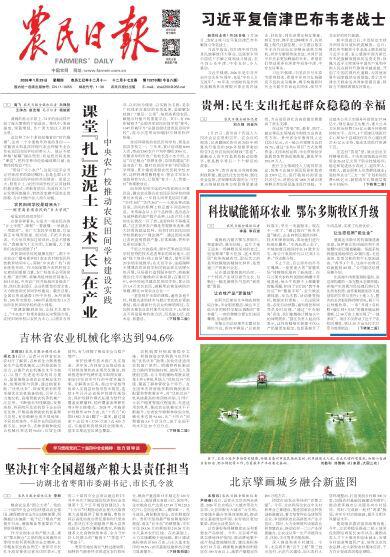 2026年1月29日,《農(nóng)民日?qǐng)?bào)》頭版刊發(fā)題為《科技賦能循環(huán)農(nóng)業(yè) 鄂爾多斯牧區(qū)升級(jí)》的文章,報(bào)道了在內(nèi)蒙古鄂爾多斯市祖祖輩輩“靠天吃飯、逐水草而居”的傳統(tǒng)被改寫,取而代之的是科技賦能的精細(xì)化種養(yǎng),是貫通三產(chǎn)的新興業(yè)態(tài)。越來越多的農(nóng)牧民,正沿著“新一產(chǎn)”鋪就的這條路,走向收入更穩(wěn)、底氣更足的好日子?! ?/p>