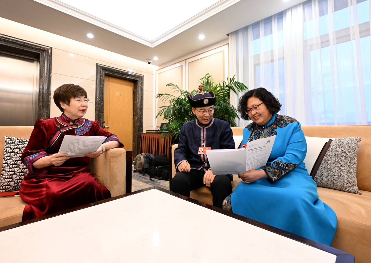 3月4日,住內(nèi)蒙古全國政協(xié)委員杜明燕(右)、納日碧力戈(中)、鄂曉梅(左)就全國政協(xié)常委會(huì)工作報(bào)告中共同關(guān)注的話題進(jìn)行交流。草原云記者 韓卿立