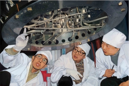 布面油畫《知難而進 眾志成城》原型為新華社記者王呈選拍攝的一幅新聞?wù)掌?,畫面?0世紀80年代末清華大學核能與新能源技術(shù)研究院王大中、馬昌文、董鐸正在進行5兆瓦低溫核反應堆調(diào)試的場景。作品生動地刻畫了以國家最高科學技術(shù)獎獲得者王大中院士等為代表的清華教師勇于承擔國家重大科技項目,知難而進、眾志成城的寶貴精神。