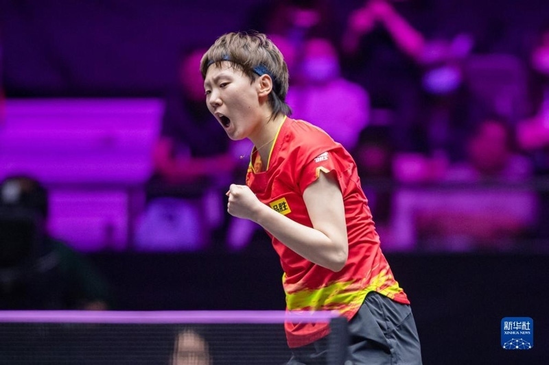 2023年4月15日,孫穎莎慶祝比賽獲勝。當(dāng)日,在河南新鄉(xiāng)舉行的世界乒乓球職業(yè)大聯(lián)盟(WTT)新鄉(xiāng)冠軍賽女單決賽中,中國(guó)選手孫穎莎以4比1戰(zhàn)勝隊(duì)友王藝迪,奪得冠軍。新華社記者 李嘉南攝