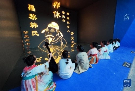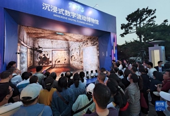 5月22日晚,在2023陜西“博物館與美好生活”文博之夜活動(dòng)上,游客參觀沉浸式數(shù)字流動(dòng)博物館。
