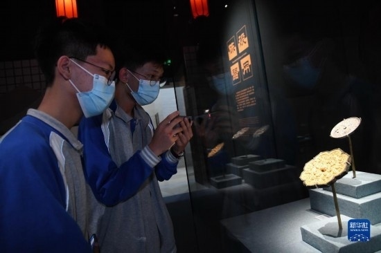 5月22日晚,游客在西安博物院《長(zhǎng)安有故里——絲路少年大唐行》展覽上參觀。